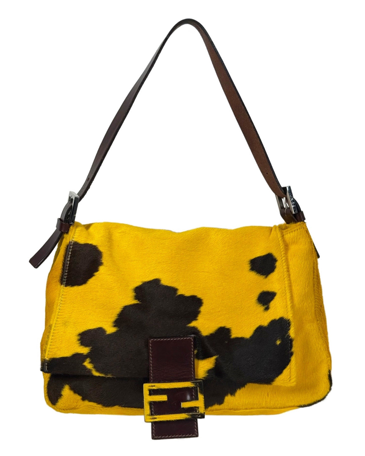 Fendi Vintage Yellow & Brown Cow Print Pony Hair Mamma Baguette Shoulder Bag