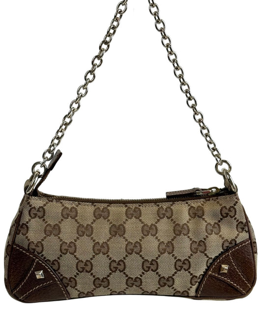 Gucci Vintage Brown GG Monogram Canvas Brown Leather Trim Chain Link Studded Shoulder Pochette Bag