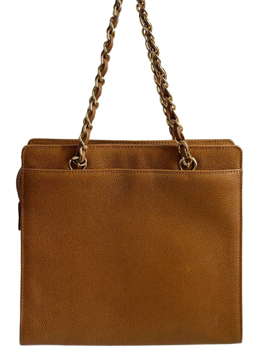Chanel Vintage 90s Cognac Light Brown Caviar Leather Small Turnlock Shoulder Tote Bag