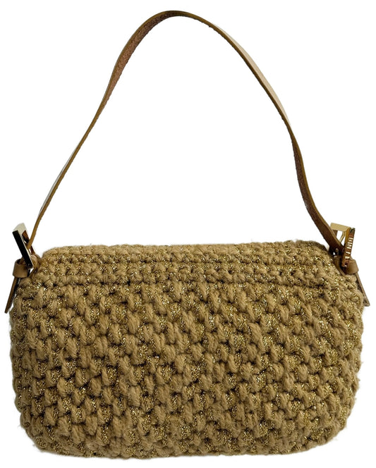 Fendi Vintage Metallic Gold Woven Wool Knit Shoulder Baguette Bag w Purple Pony Hair Logo