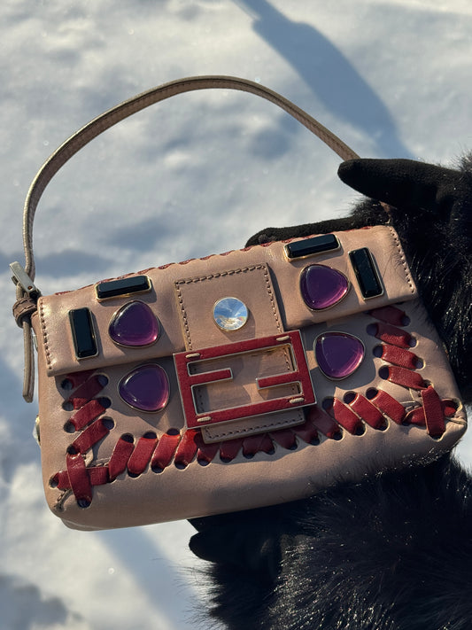 Fendi Mauve Leather Burgundy Stitch Embellished Jeweled Mini Baguette Shoulder Bag