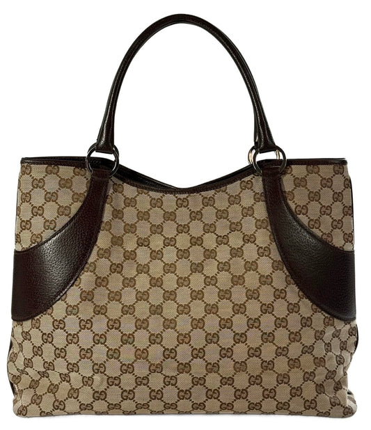 Gucci Vintage Brown GG Monogram Brown Leather Trim Top Large Shoulder Tote Bag