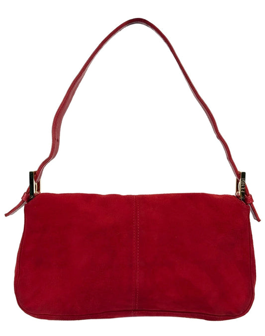 Fendi Vintage Red Suede Purple Glitter Logo Shoulder Baguette Bag