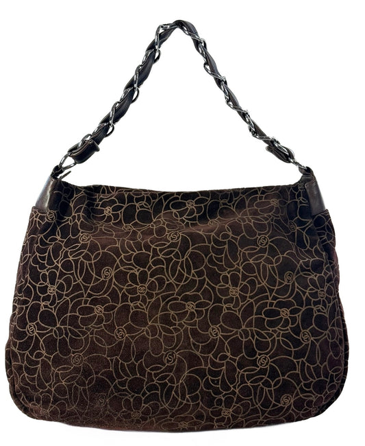 Chanel Vintage 00s Brown Suede Camellia Embossed Hobo