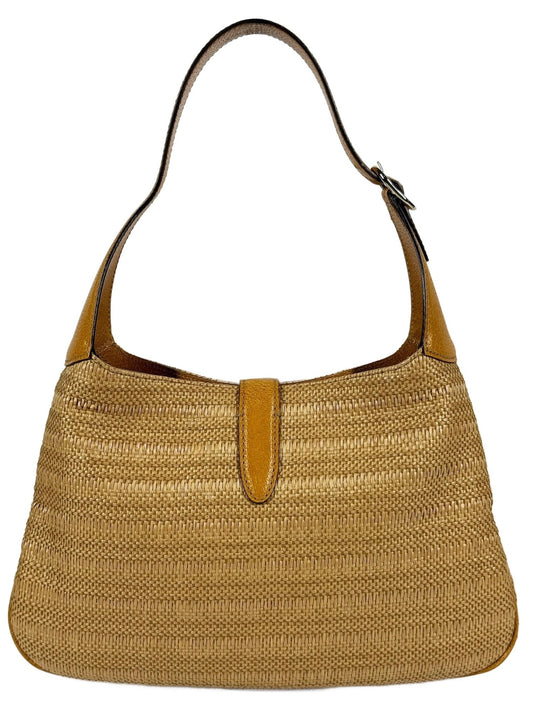 Gucci Vintage Embroidered Sequin Raffia Jackie Shoulder Bag w Gold Leather Trim