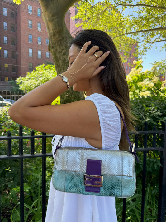 Fendi Vintage Silver Blue Purple Fuchsia Ombré Snakeskin Baguette Shoulder Bag