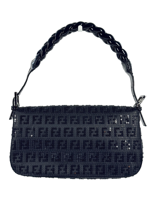 Fendi Black Patent Leather Zucca Monogram Sequin Shoulder Baguette Bag