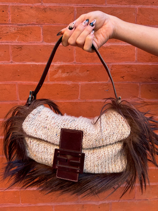 Fendi Vintage Multicolor Wool Knit Crochet Hair Trim Shoulder Baguette Bag