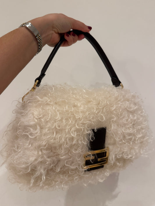 Fendi Ivory Fur Effect Mohair Wool Medium Shoulder Baguette Bag
