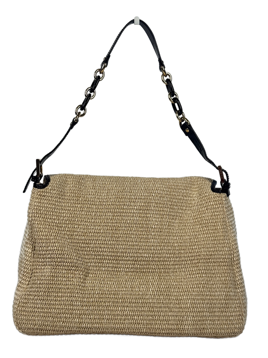 Fendi Vintage Beige Raffia Black Snakeskin Patent Leather Trim XL Mamma Baguette Shoulder Bag
