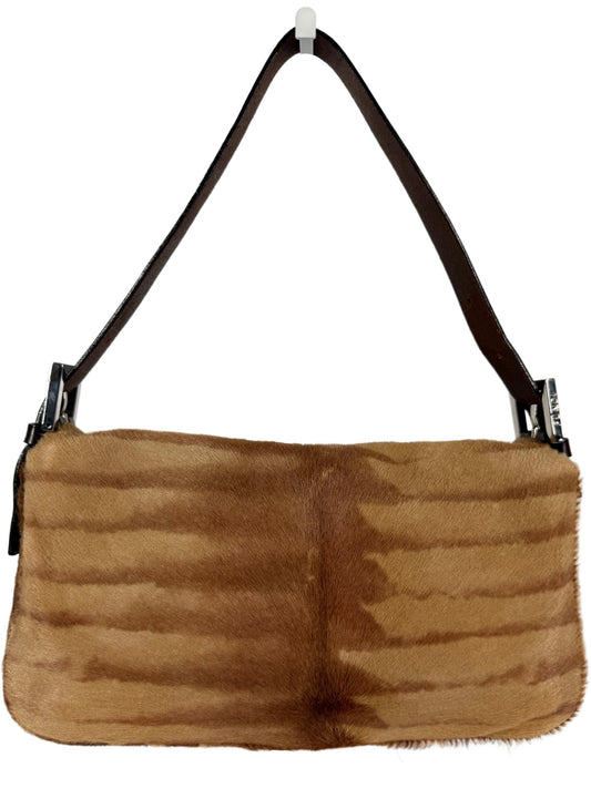 Fendi Vintage Brown Beige Giraffe Print Pony Hair Shoulder Baguette Bag