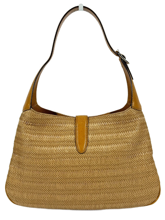 Gucci Vintage Embroidered Sequin Raffia Jackie Shoulder Bag w Gold Leather Trim
