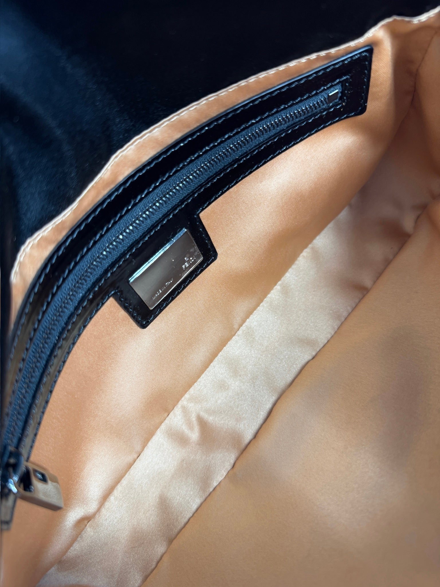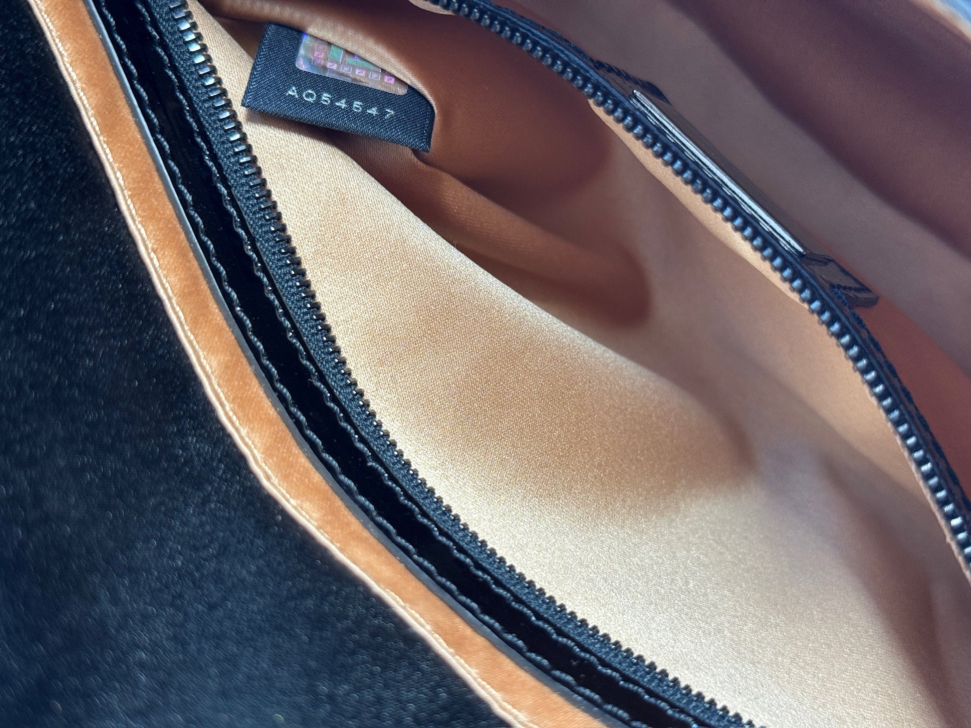 An absolutely iconic and rare Baguette, this showstopping piece features a sleek black patent leather finish and a beautifully braided handle. Intricate sequin detailing brings the classic Zucca logo to life, catching the light and everyone’s attention. A must-have for collectors and fashion lovers alike.