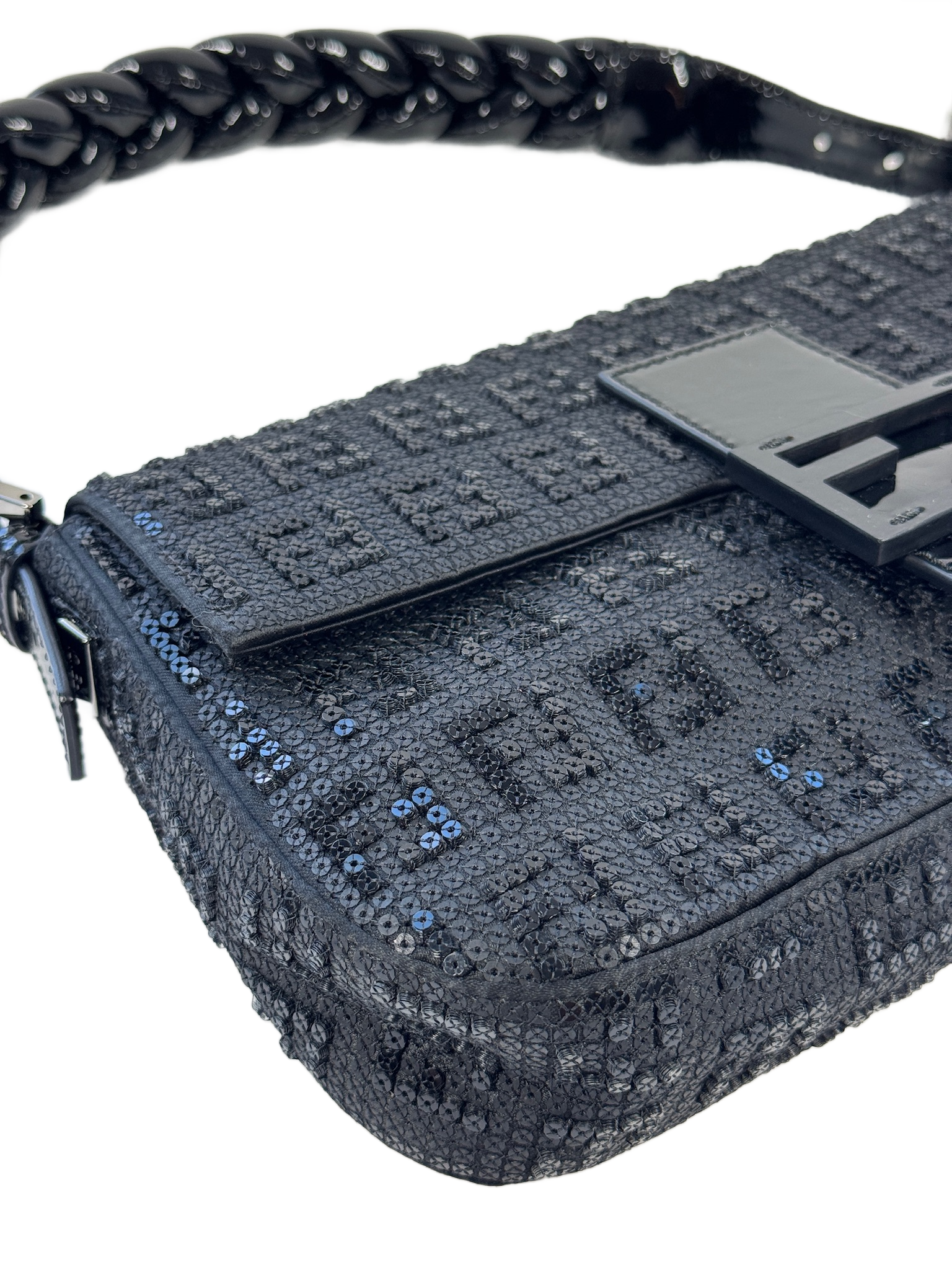 Fendi Black Patent Leather Zucca Monogram Sequin Shoulder Baguette Bag