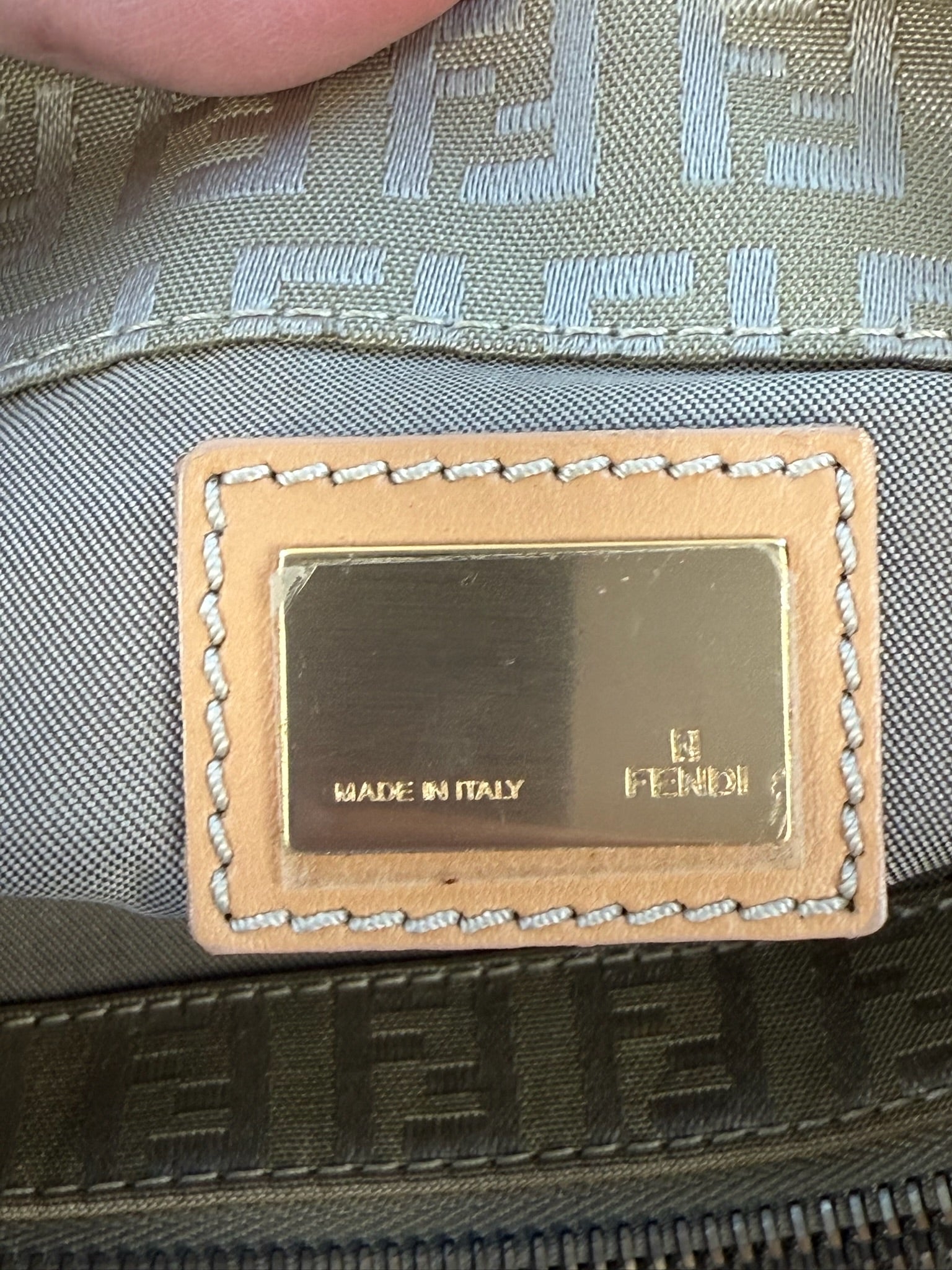 Hot, classic, and practical. The iconic Fendi Zucca canvas shimmers with warm golden tones, complemented by beige leather trim. Matches everything in your wardrobe.