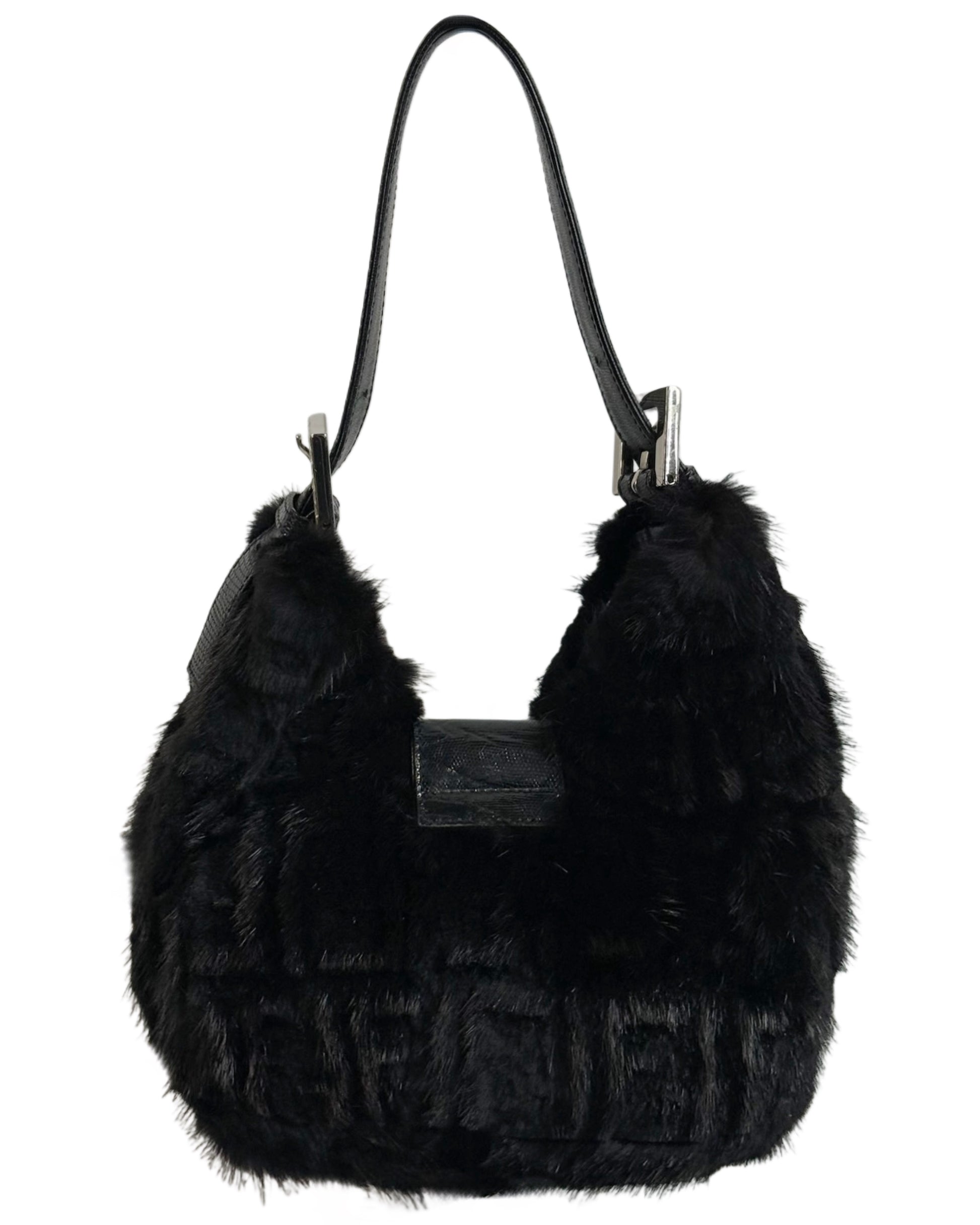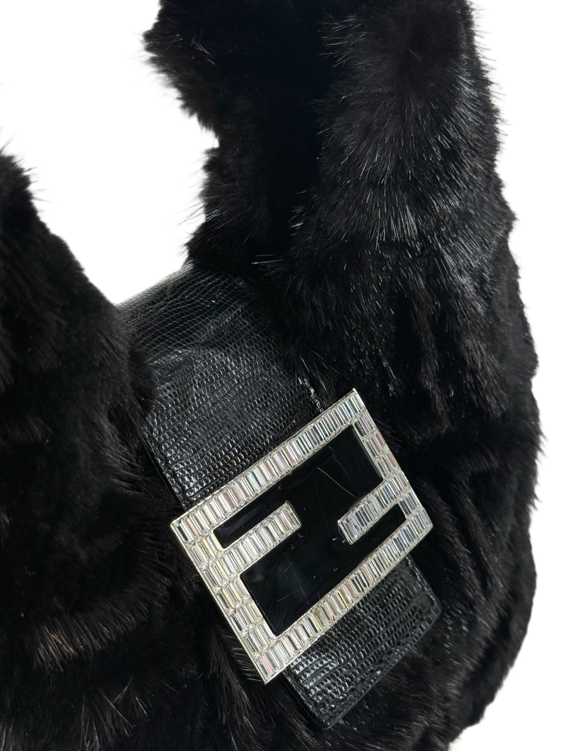 Fendi Vintage Black Zucca Mink Fur Crystal Logo Lizard Trim Shoulder Hobo Mini Baguette Bag