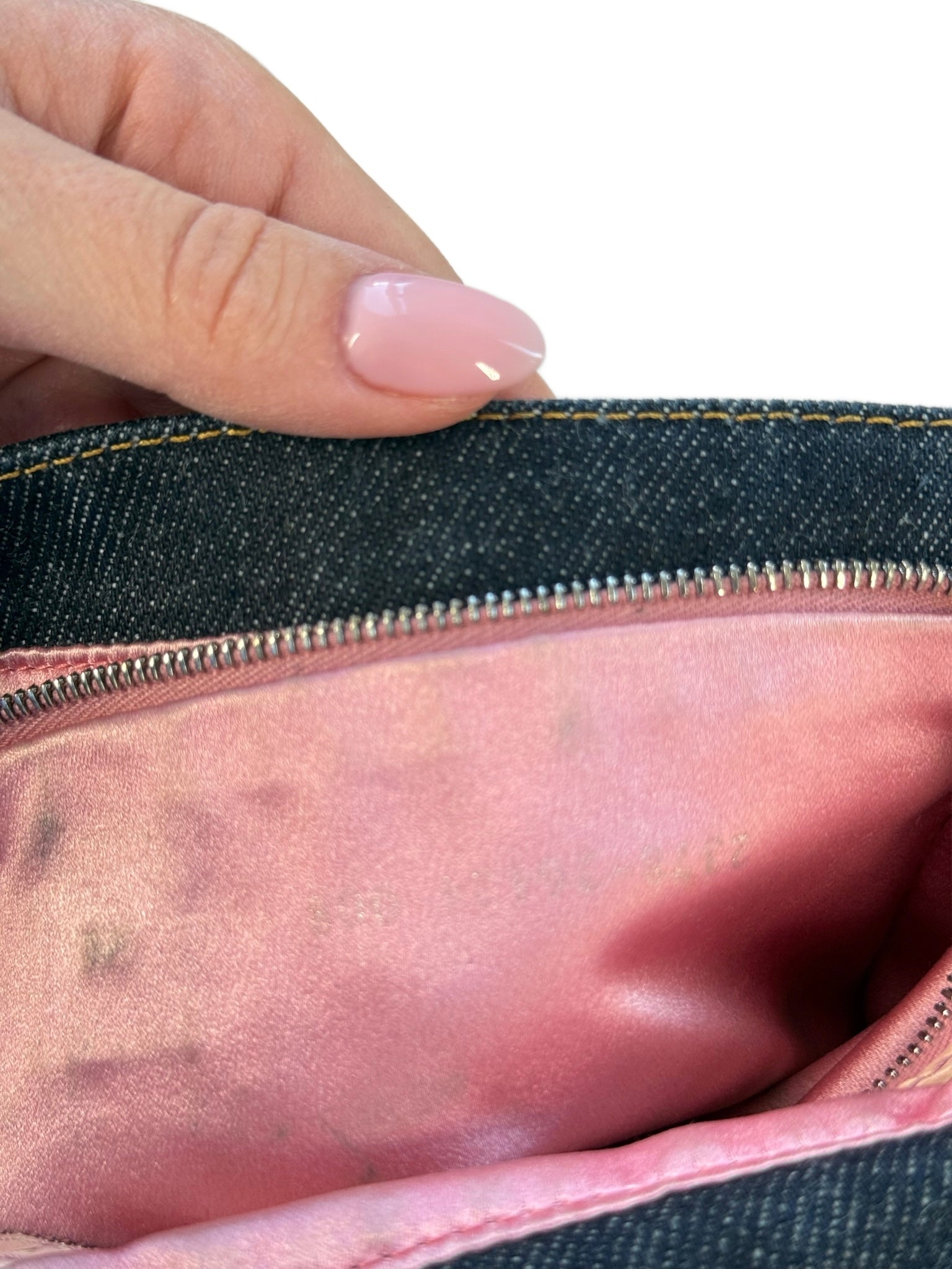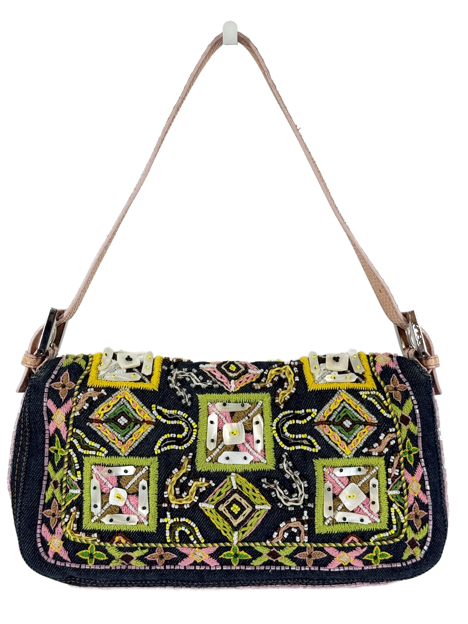 Fendi Vintage Blue Denim Pink Lizard Trim Green Fringe Beaded Embroidered Shoulder Baguette Bag