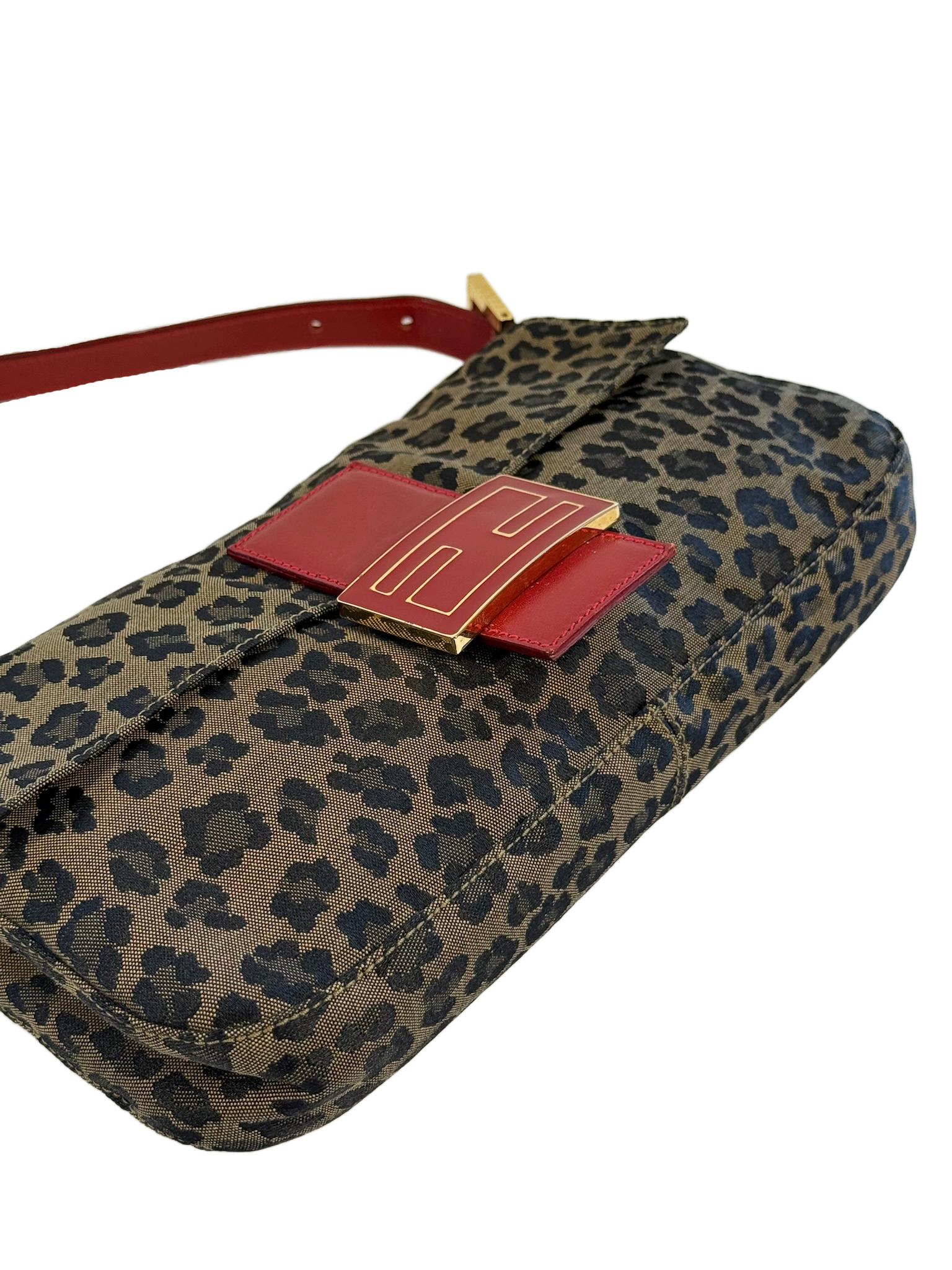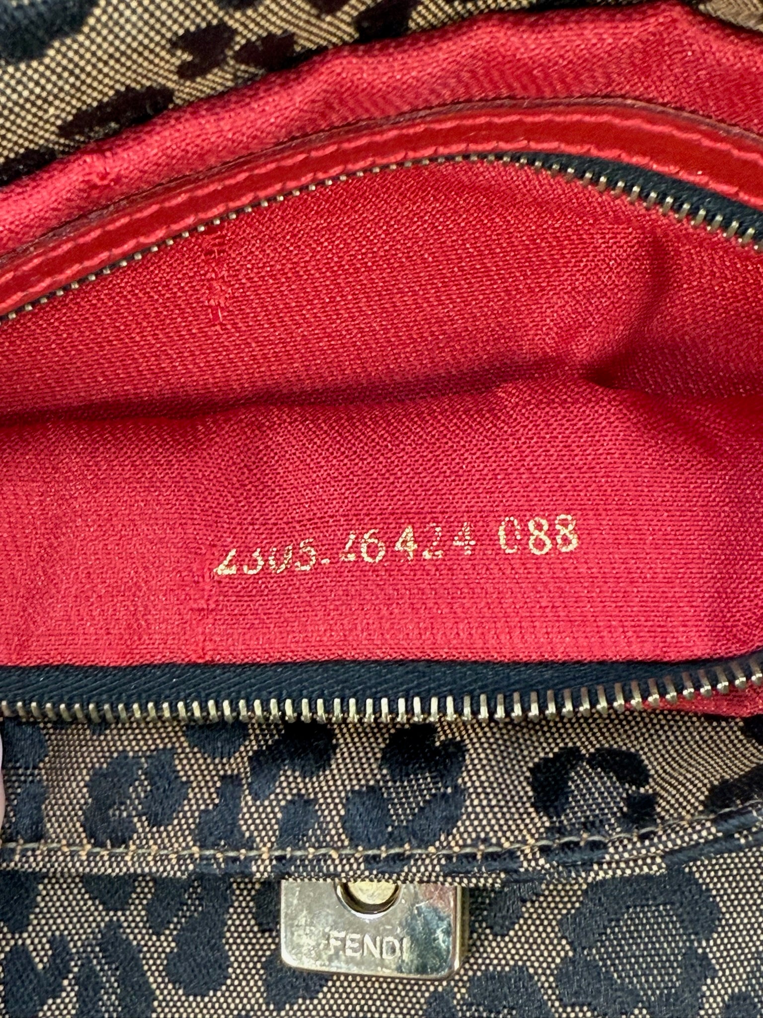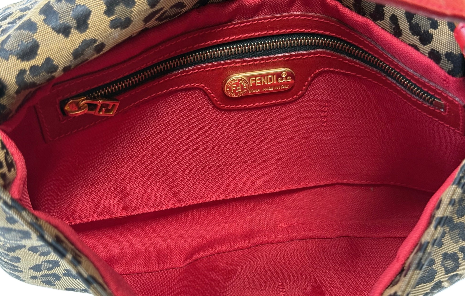 Fendi Vintage Brown Leopard Canvas Red Leather Trim Baguette
