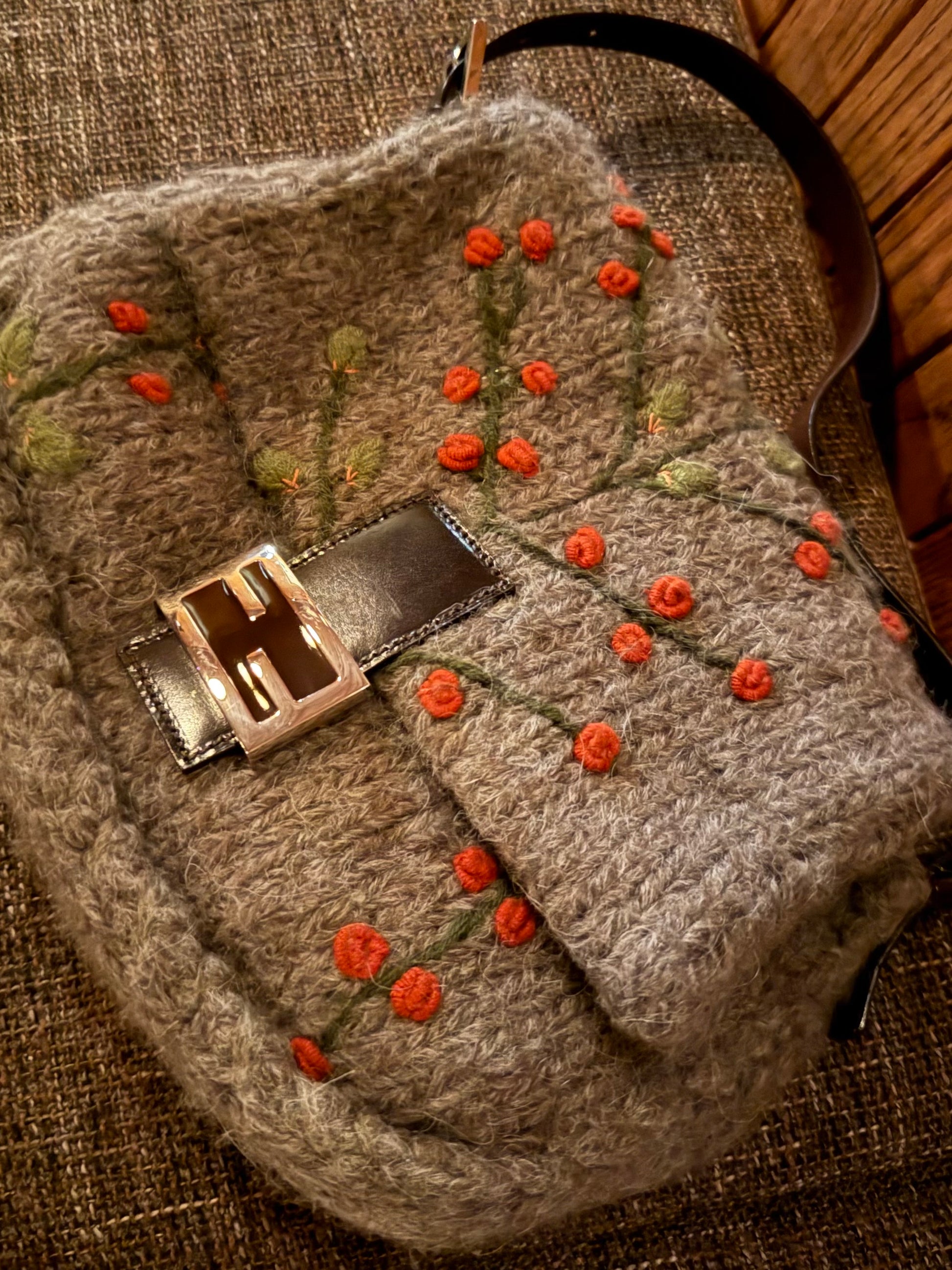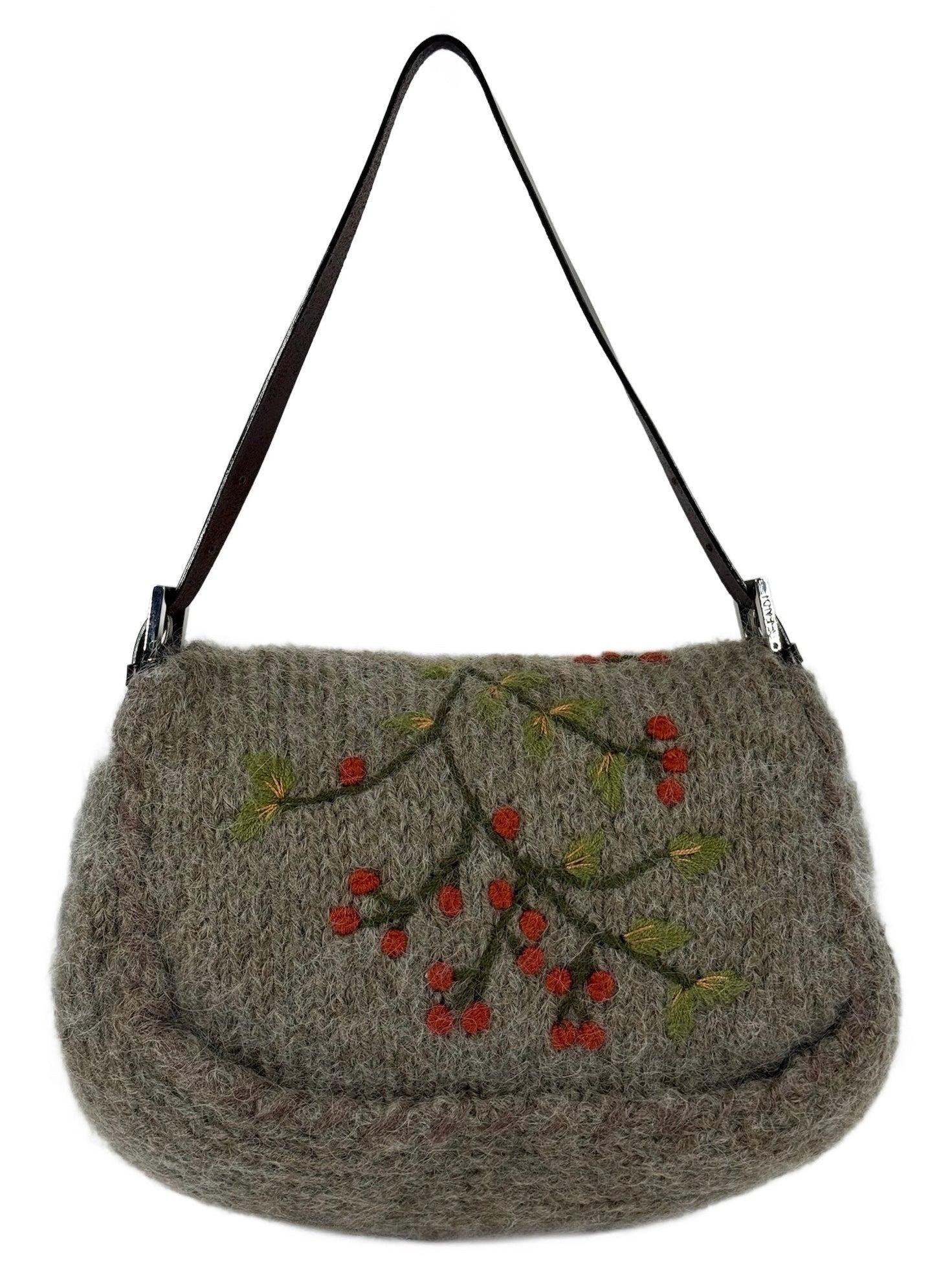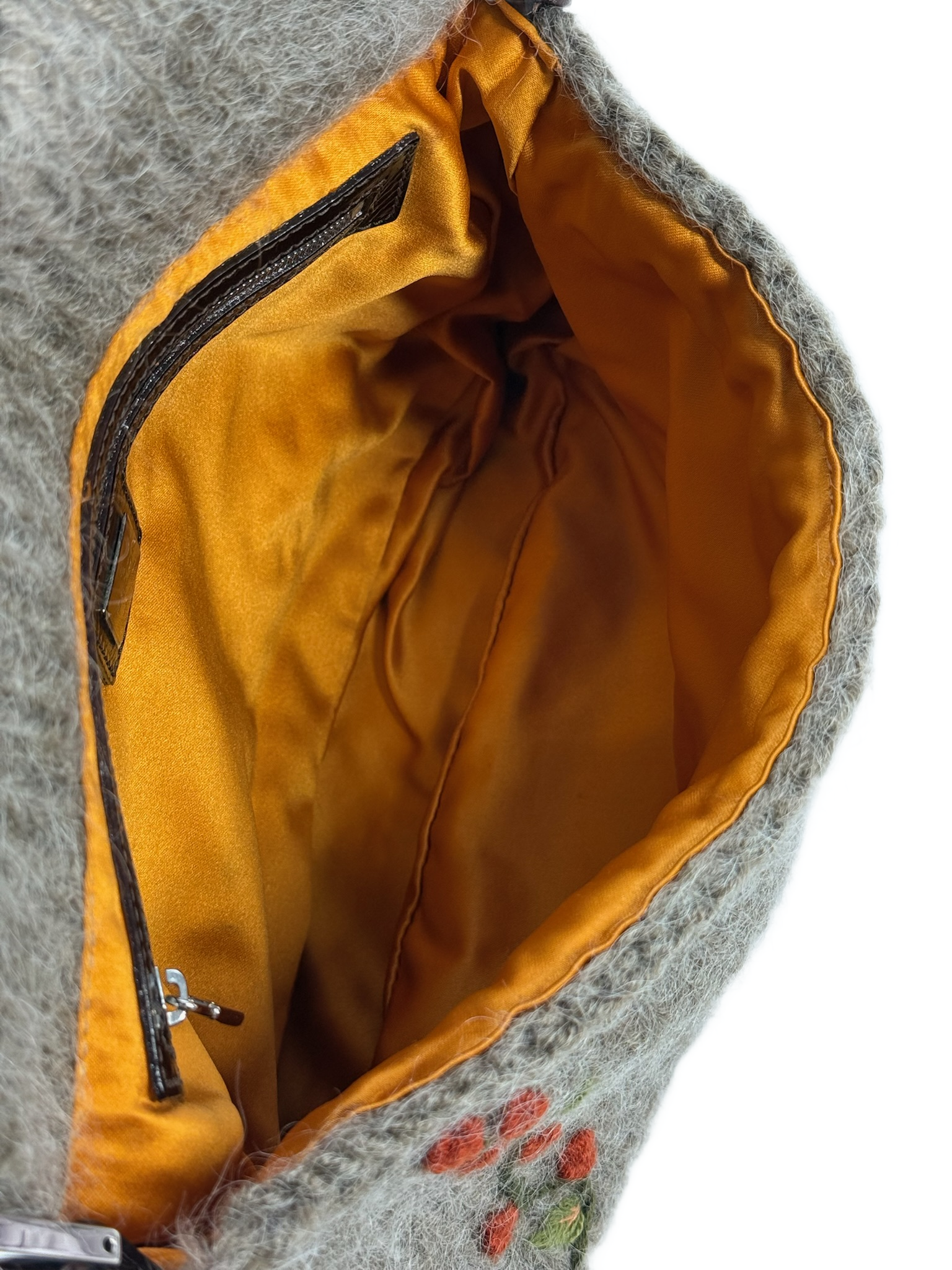 Fendi Vintage Grey Wool Knit Cherry Embroidered Shoulder Mamma Baguette Bag
