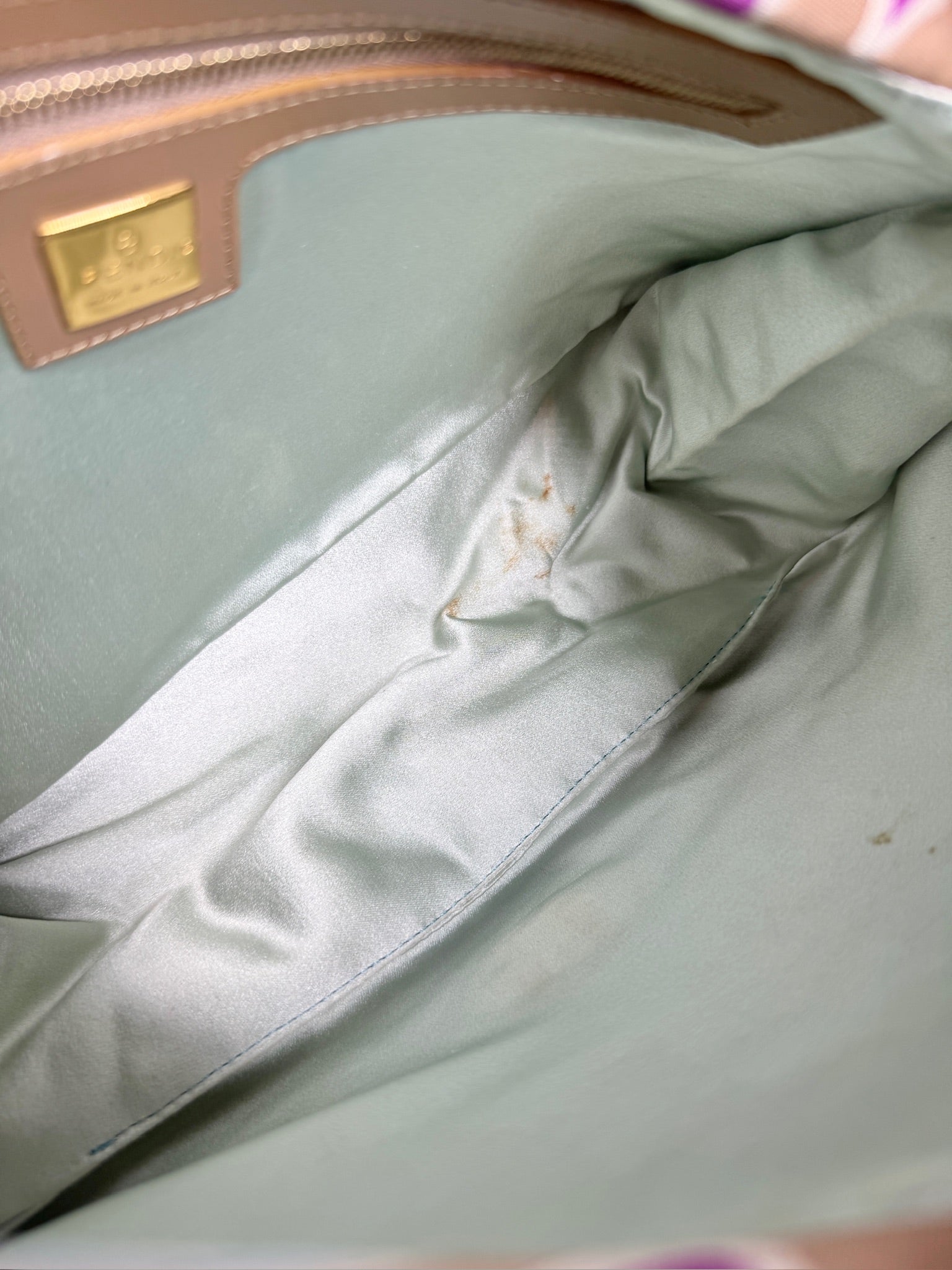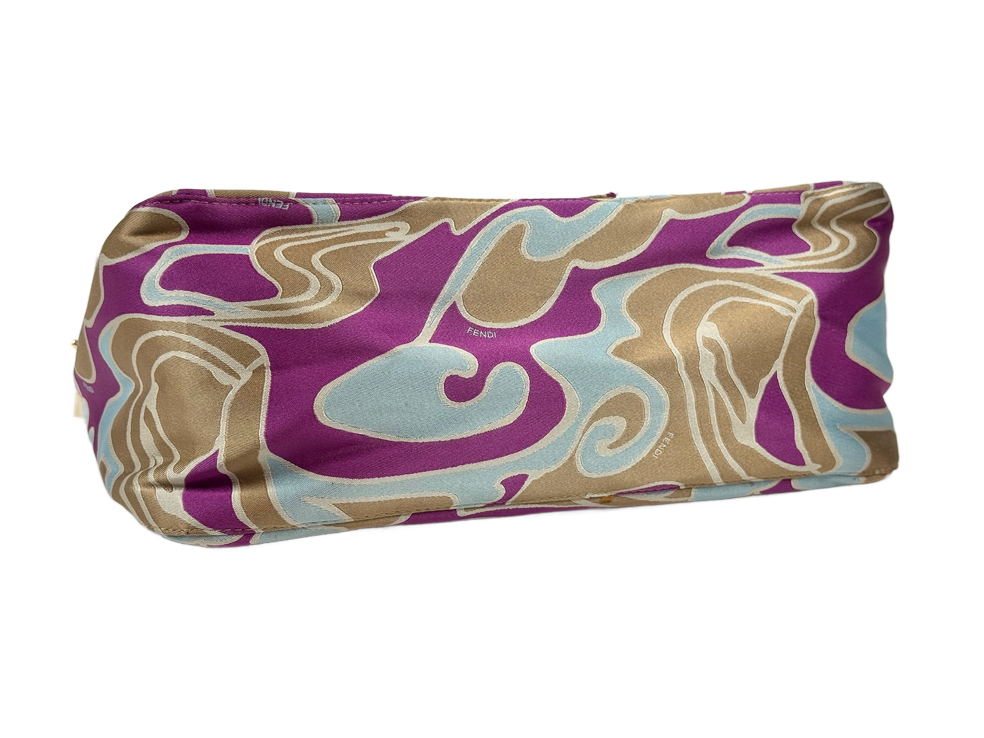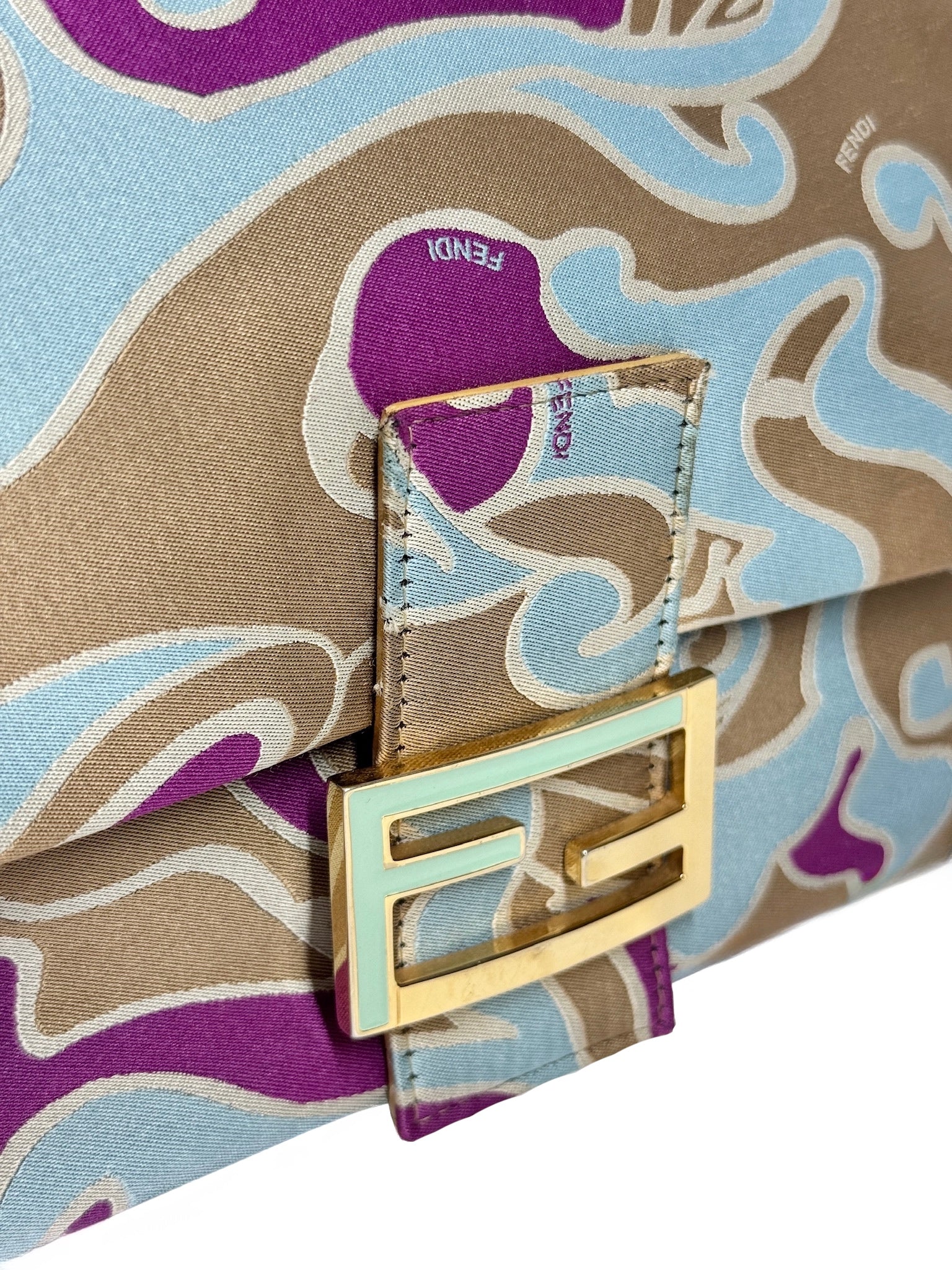 A stunning, rare Fendi Mamma Baguette, both practical and insanely cool. Psychedelic purple, blue, and beige tones dance across the bag, blending early-2000s nostalgia with modern street-chic sophistication.