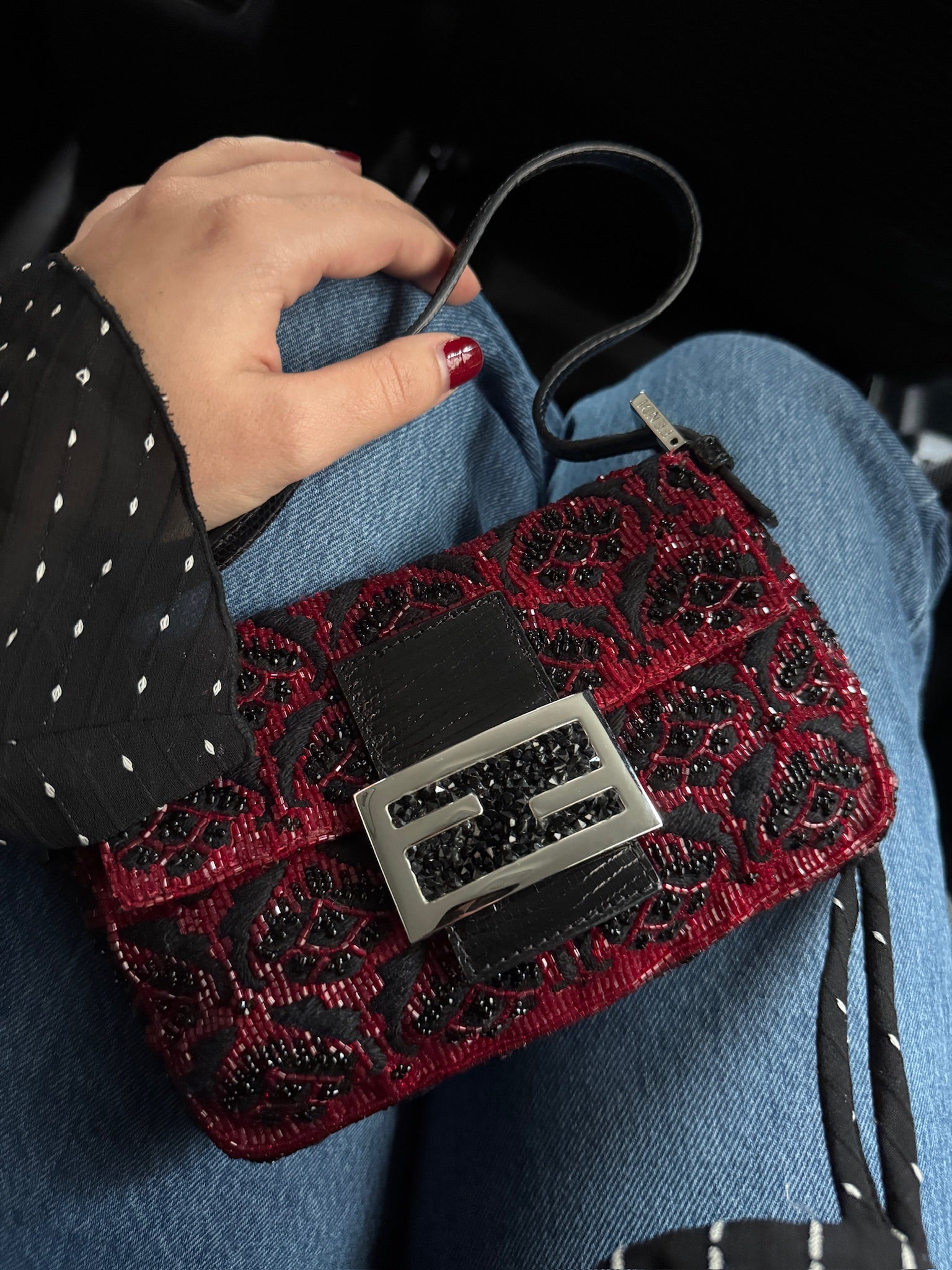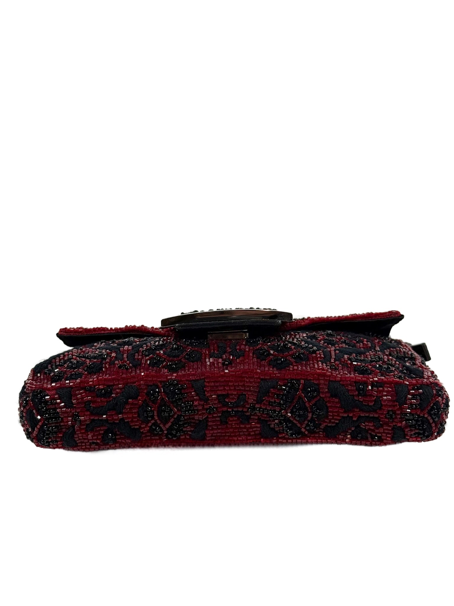 Fendi Vintage Red & Black Beaded Lizard Trim Crystal Embellished Mini Baguette Bag