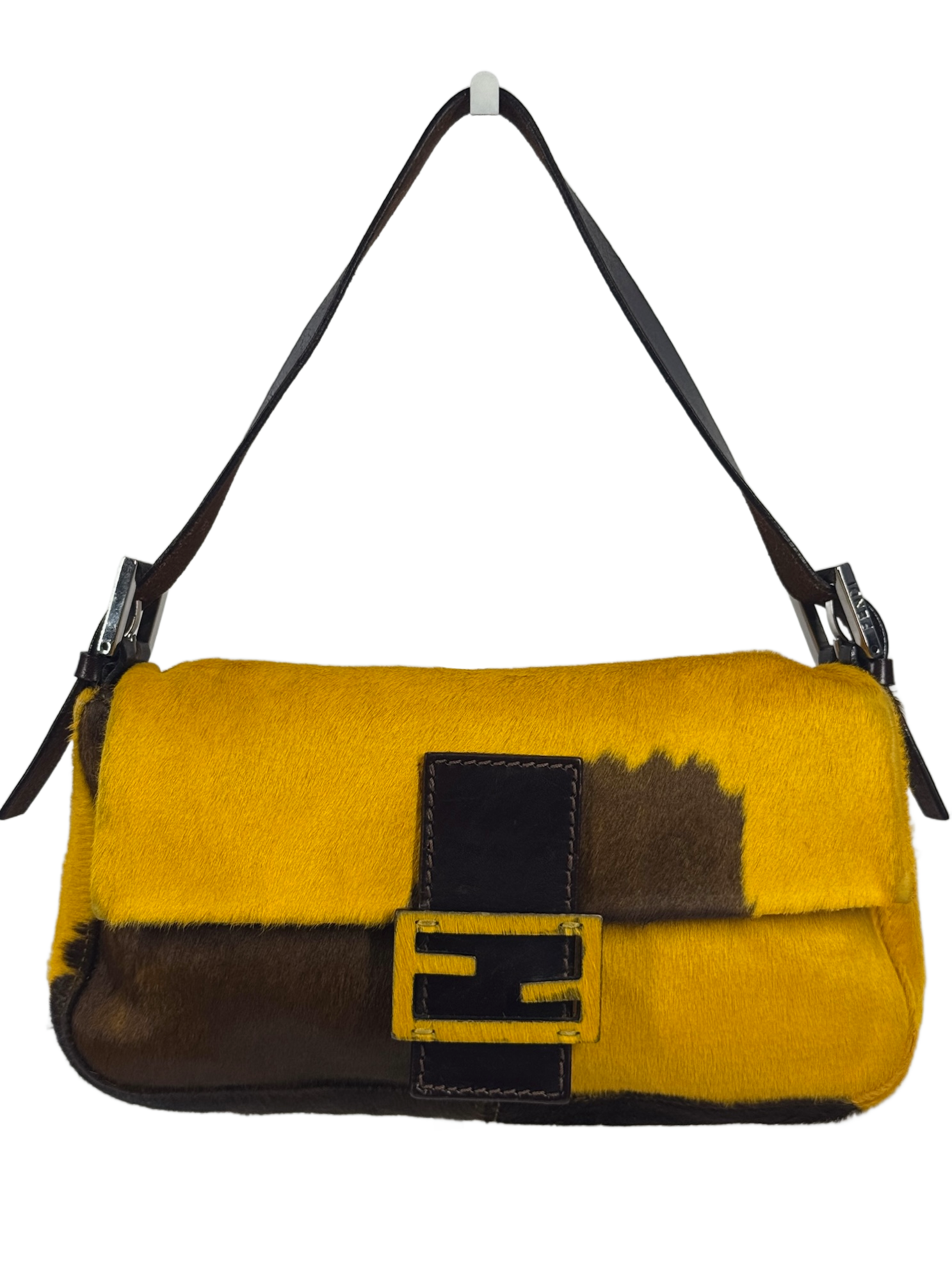 Make a wild statement with this Fendi Vintage Baguette, featuring striking yellow and brown cow print pony hairthat’s equal parts edgy and playful. This iconic shoulder bag blends quirky texture with Fendi’s signature sophistication, perfect for adding a fun, fashion-forward twist to any outfit.