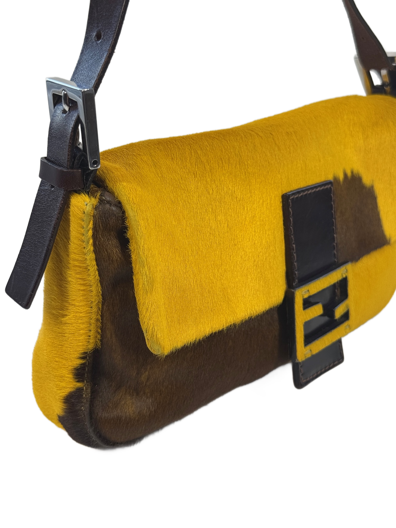 Fendi Vintage Yellow & Brown Cow Print Pony Hair Shoulder Baguette Bag