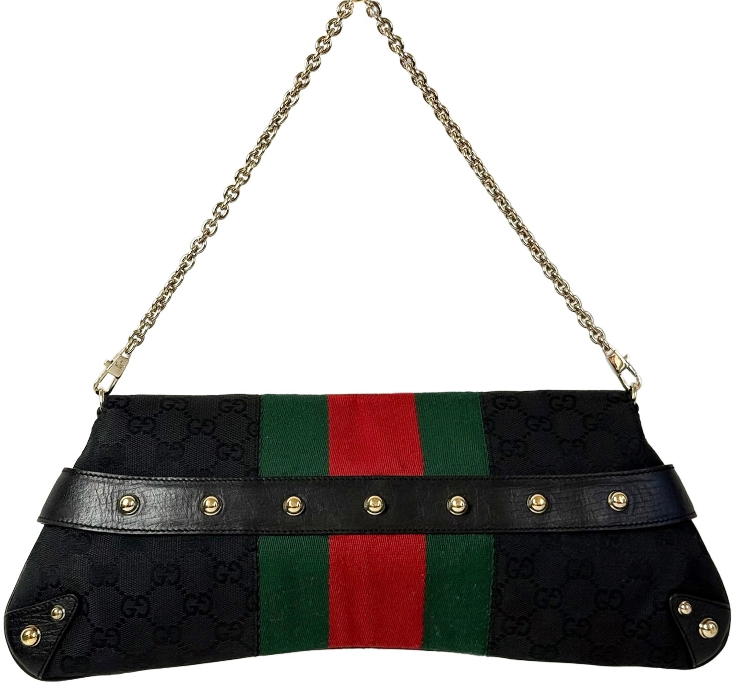 Gucci Vintage Black GG Monogram Webb Stripe Large Horsebit Chain Shoulder Clutch Bag