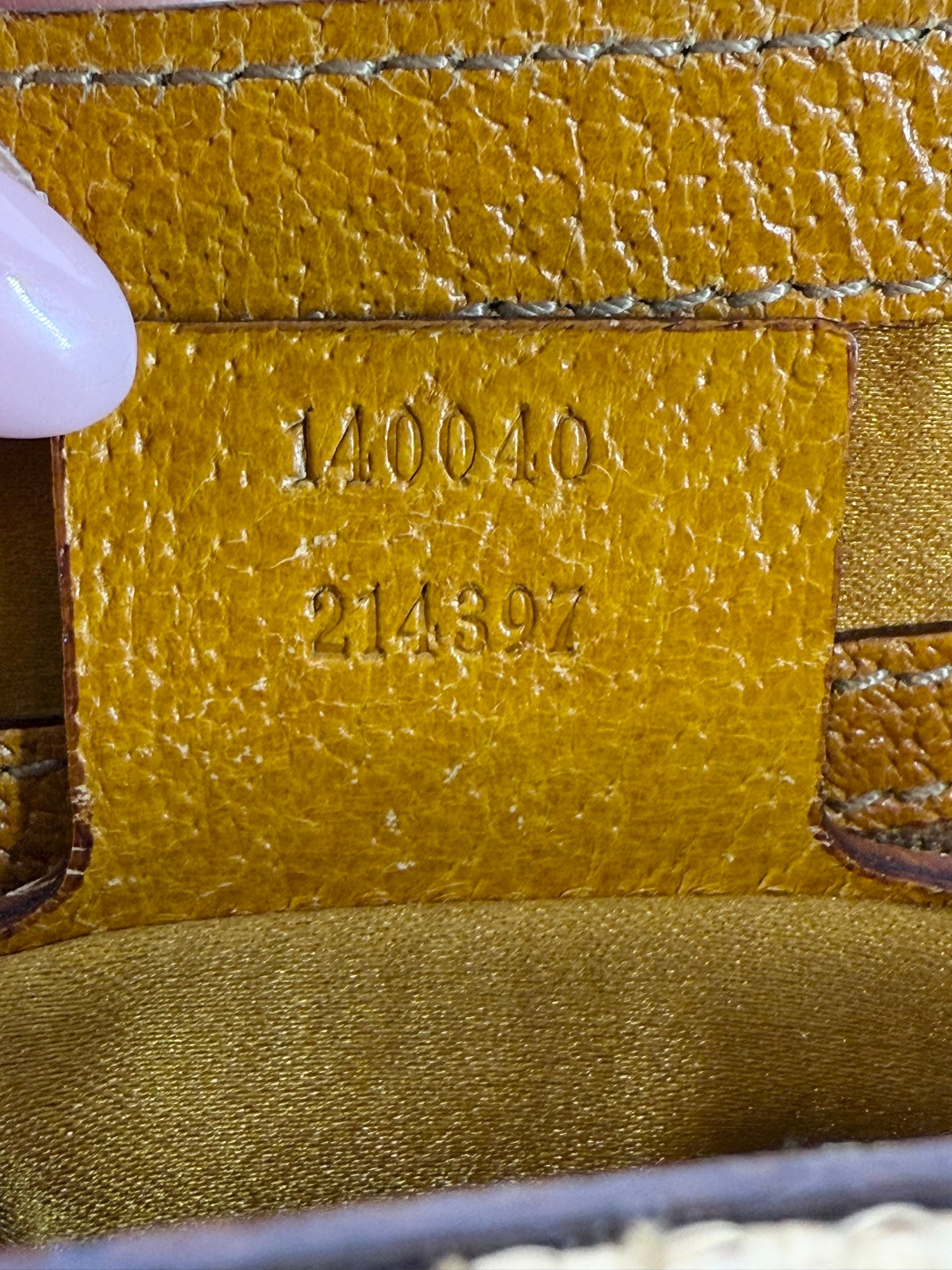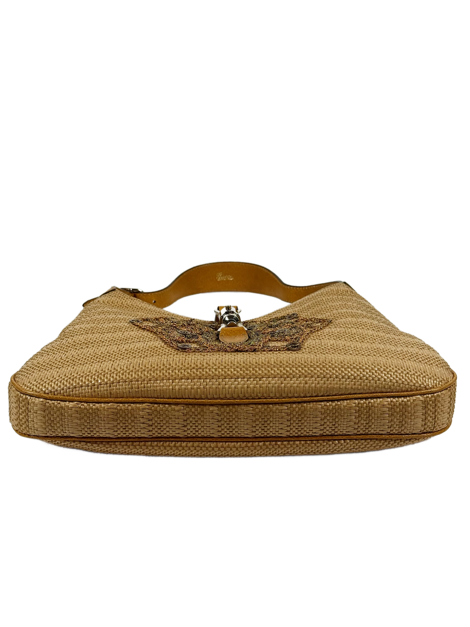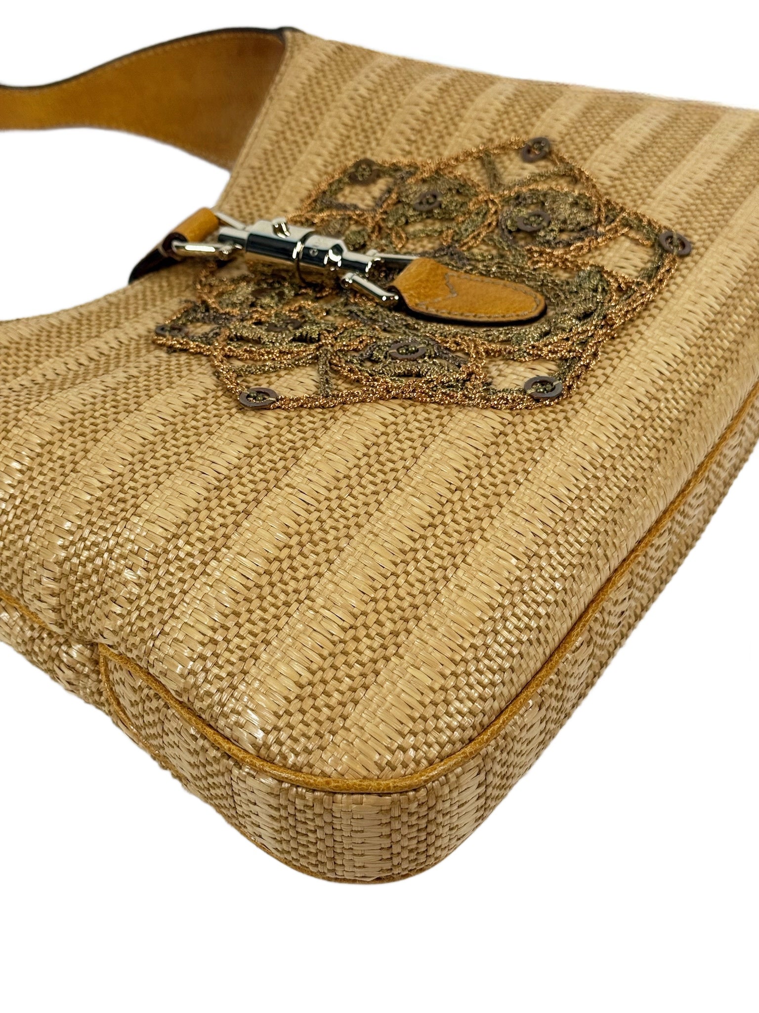 Gucci Vintage Embroidered Sequin Raffia Jackie Shoulder Bag w Gold Leather Trim