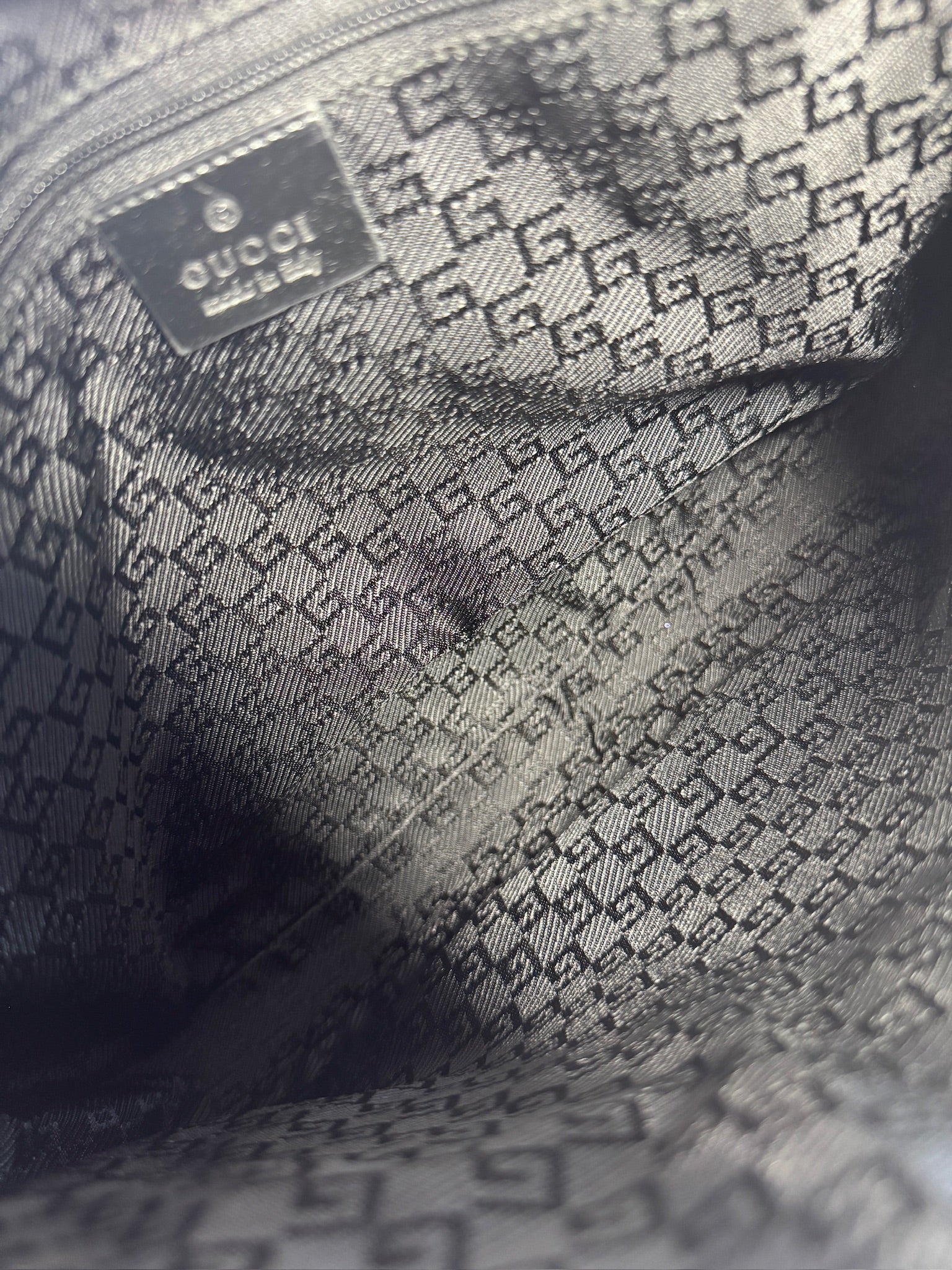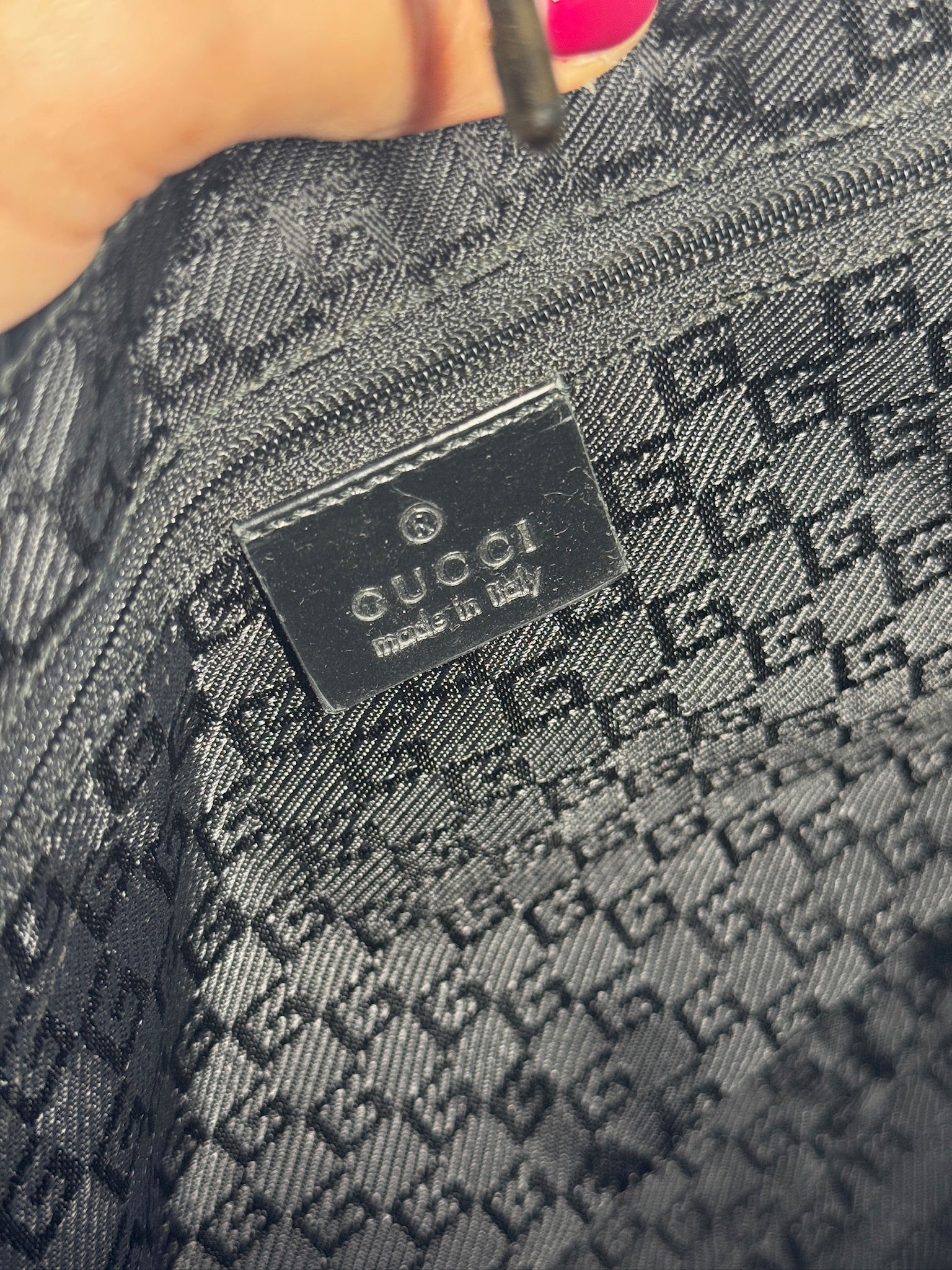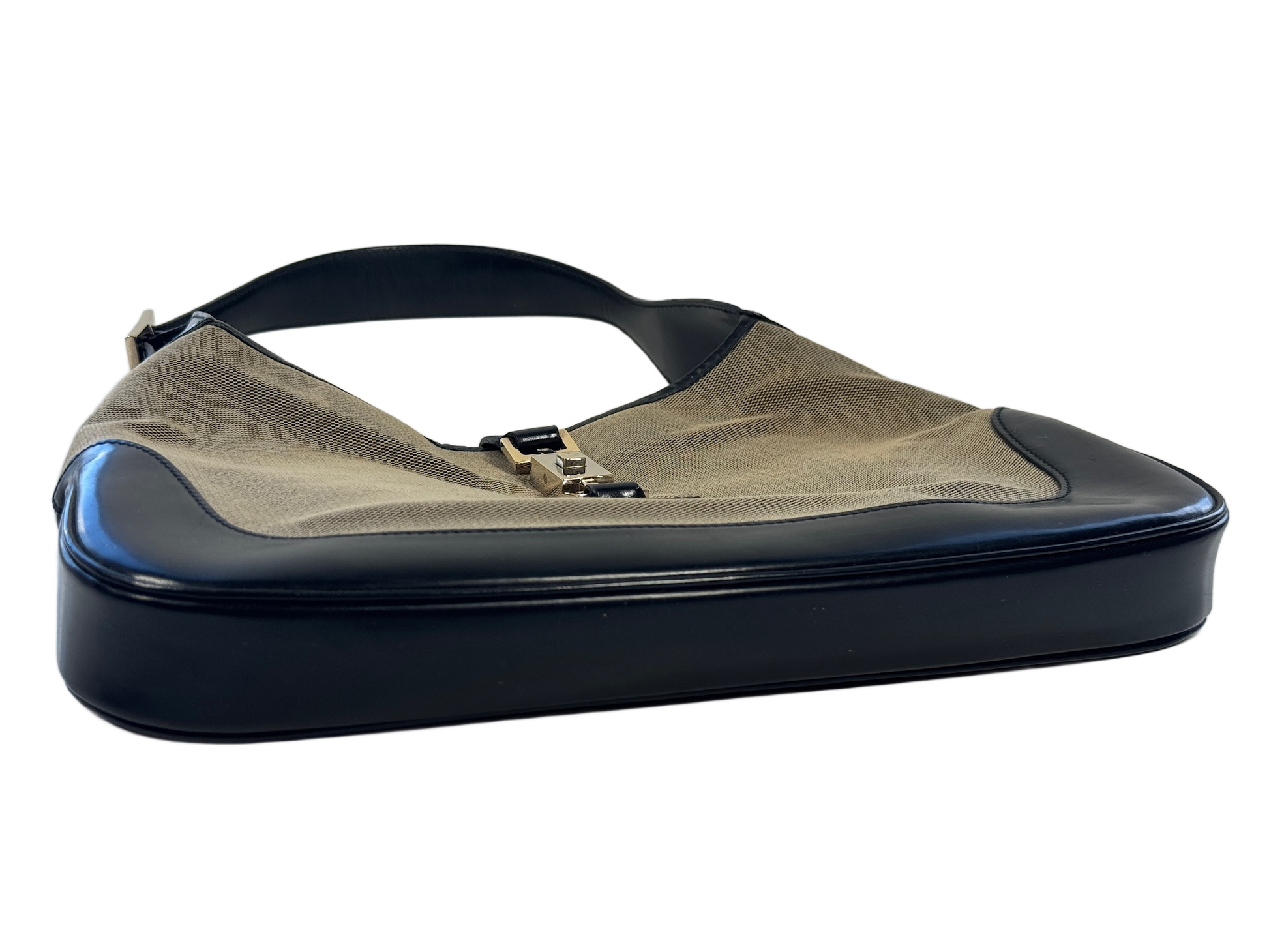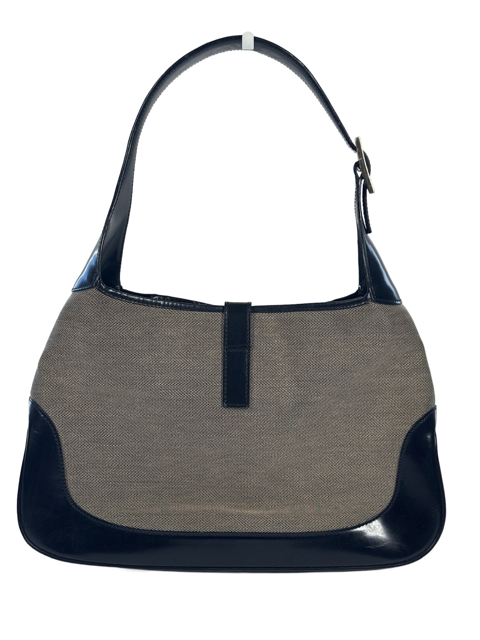 Gucci Vintage Medium Jackie O Beige Canvas Black Patent Leather Shoulder Bag